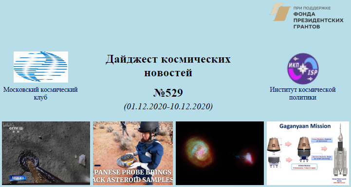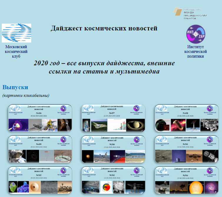 Задача №1: Создание информационного поля проекта, направленного на популяризацию знаний о космосе в современном обществе, включает три элемента: 1. Доклады членов МКК по актуальным вопросам космонавтики, распространенные в интернете. (Частично отражены здесь.) 2. Регулярная помощь СМИ в части объяснения и комментирования событий в отечественной и мировой космонавтике. За 2-е полугодие 2020 г. было сделано более 100 материалов разного объема для 50 различных СМИ. 3. Дайджест космических новостей, выпускаемый МКК совместно с Институтом космической политики 3 раза в месяц. Дайджест распространяется на безвозмездной основе. Архив выпусков Дайджеста можно посмотреть в облаке или (систематизировано) здесь. Дайджест дает декадный абрис наиболее важных космических событий на планете. В рамках проекта "Понятный космос" при поддержке Фонда президентских грантов МКК выпущены следующие Дайджесты:
