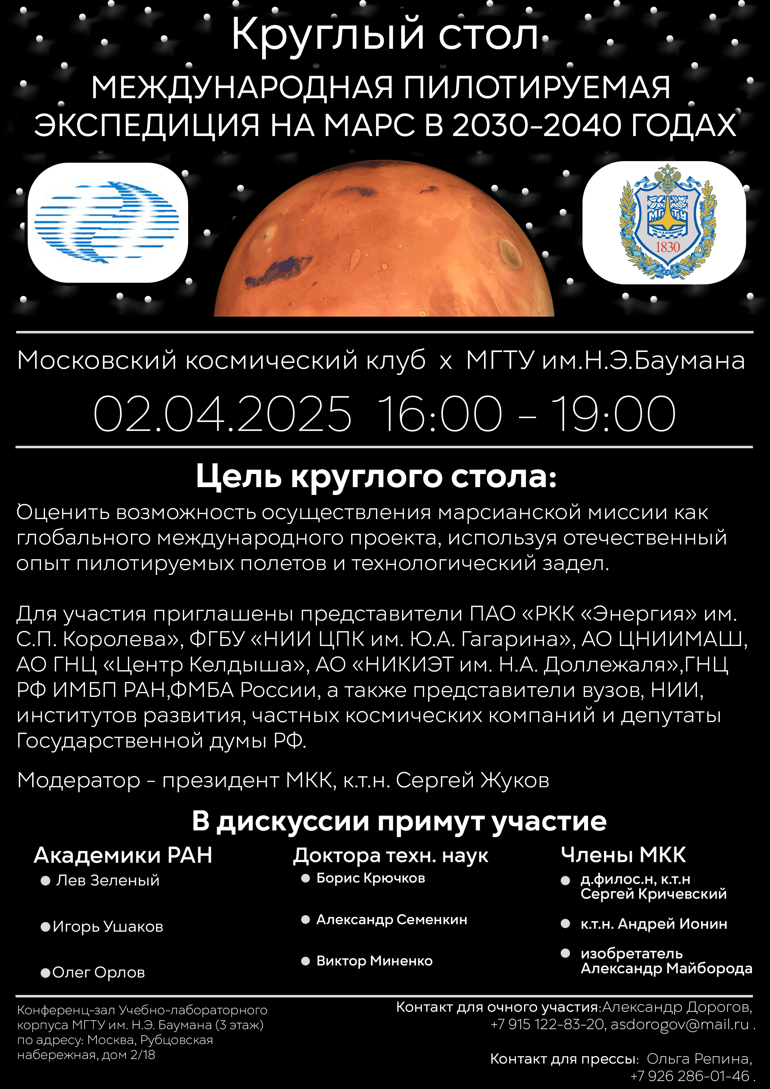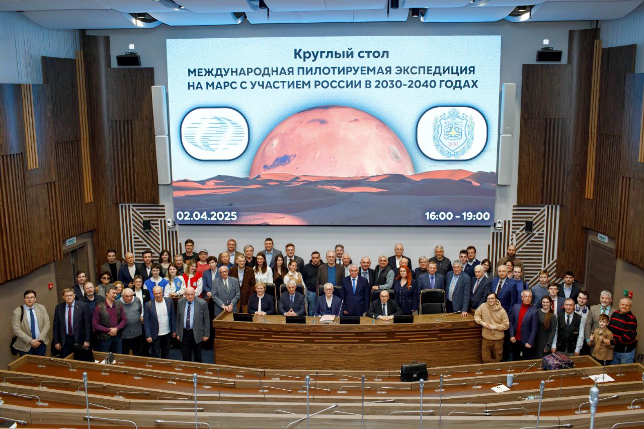 Круглый стол прошел 2 апреля 2025 года в Москве, в МГТУ им. Н.Э. Баумана. Его организовали Московский космический клуб (МКК) и МГТУ им. Н.Э. Баумана при поддержке Инфраструктурного центра 2.0 «Аэронет». В Конференц-зале Учебно-лабораторного корпуса для обсуждения практических вопросов пилотируемой миссии к Красной планете собрались специалисты профильных организаций госкорпорации «Роскосмос» (РКК «Энергия им. С.П. Королёва», ЦНИИмаш, Центра им. М.В. Келдыша, Центра подготовки космонавтов им. Ю.А. Гагарина), ФМБА России, ИКИ РАН, ИМБП РАН и других научных институтов Минобрнауки, а также студенты, аспиранты и преподаватели МГТУ им. Н.Э. Баумана, МАИ, МГУ им. М.В. Ломоносова, представители институтов развития и частных космических компаний, журналисты. Ведущий, президент МКК, к.т.н., космонавт-испытатель Сергей Жуков, обозначил основную цель Круглого стола: оценить возможность осуществления Марсианской пилотируемой миссии как глобального международного проекта, используя отечественный опыт пилотируемых полетов и технологический задел. Он отметил, что нынешнее мероприятие задумано как первое из серии обсуждений обозначенной темы среди профессионального сообщества. С постановочным докладом на тему «Вперед, на Марс! Краткая история и новый взгляд на цель и сверхзадачу пилотируемой экспедиции» выступил д.филос.н., к.т.н., профессор, главный научный сотрудник ИИЕТ им. С.И. Вавилова РАН, космонавт-испытатель, член МКК Сергей Кричевский. Об истории изучения Марса автоматическими аппаратами, о негостеприимном климате этого небесного тела рассказал научный руководитель ИКИ РАН академик Лев Зелёный в докладе «Марс. Мечта о запасной планете для человечества». Выступивший вслед за ним главный научный сотрудник Центра им. М.В. Келдыша, заведующий кафедрой Э-8 МГТУ им. Н.Э. Баумана, д.т.н., профессор Александр Семёнкин рассказал о возможностях современных энергодвигательных систем для выполнения межпланетных перелетов. Тему подхватил начальник научно-технического центра РКК «Энергия им. С.П. Королева» Андрей Лобыкин, сообщивший о текущем состоянии проекта Марсианского экспедиционного комплекса. Главный научный сотрудник ЦПК им. Ю.А. Гагарина д.т.н. Борис Крючков рассказал об отработке методики подготовки космонавтов к марсианской экспедиции. После полета на МКС в условиях микрогравитации, сразу по возвращению на Землю космонавты Роскосмоса, участвующие в этом исследовании, выполняют задания по циклограмме предполагаемой посадки и работы на Марсе. Изучению влияния неблагоприятных факторов (радиации, невесомости, гипомагнитного поля, психологических и др.) и рисков полета на Марс, их воздействий на человека, аспектам защиты и безопасности были посвящены сообщения директора ИМБП РАН академика Олега Орлова и главного научного сотрудника ГНЦ ФМБЦ им. А.И. Бурназяна ФМБА России академика РАН Игоря Ушакова. Выступивший следом академик РАКЦ, заслуженный конструктор РФ, конструктор и организатор работ по созданию ракетно-космической техники, к.т.н. Николай Севастьянов обратил внимание собравшихся на критическую необходимость создания отечественной сверхтяжелой ракеты для освоения Луны и Марса. Старейший работник отрасли, профессор МГТУ им. Н.Э. Баумана, д.т.н. Виктор Миненко рассказал о студенческих и аспирантских «марсианских» проектах, в том 