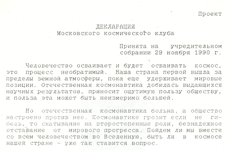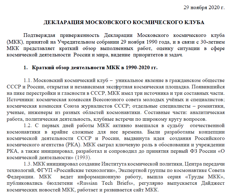 Подтверждая приверженность Декларации Московского космического клуба, принятой на Учредительном собрании 29 ноября 1990 года, и в связи с 30-летием МКК представляет краткий обзор выполненных работ, оценку ситуации в сфере космической деятельности России и мира, видение приоритетов и задач. |