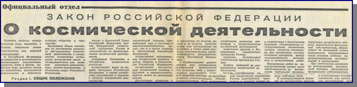 Закон Российской Федерации «О космической деятельности», первый закон о космосе в нашей стране, разработан по Договору между ВС РСФСР и МКК |